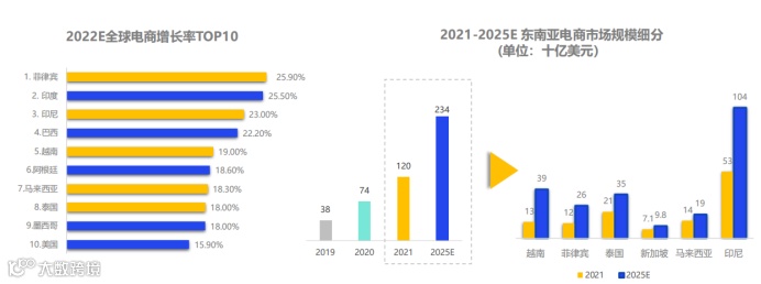 东南亚电商市场逆势高速增长,除新加坡外,菲律宾、印尼、越南、马拉西亚及泰国均进入2022年全球电商增长率TOP10国家。