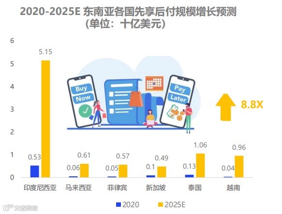 随着数字金融服务行业的不断发展,东南亚消费年轻群体明显,“先享后付”模式兴起,分期付款的方式以及灵活的付款方案,降低用户“一次付清”的经济压力,凭借较低的征信门槛深受千禧及Z世代消费者的青睐,预计到2025年 东南亚“先享后付”支付规模将从2020的9.1亿美元上涨到88.3亿美元,实现8.8倍增长。