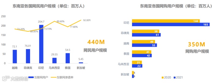 据数据显示,东南亚在2021年新增互联网用户约4000万人,东南亚地区网民达4.4亿人,新加坡、马来西亚互联网渗透率分别能达到92.00%及89.60%,在疫情的影响下,线上消费增长率逐渐增强,2021年东南亚2021年东南亚网购用户比2020年增加约3000万人,占全体互联网用户的80%,规模达3.5亿人。