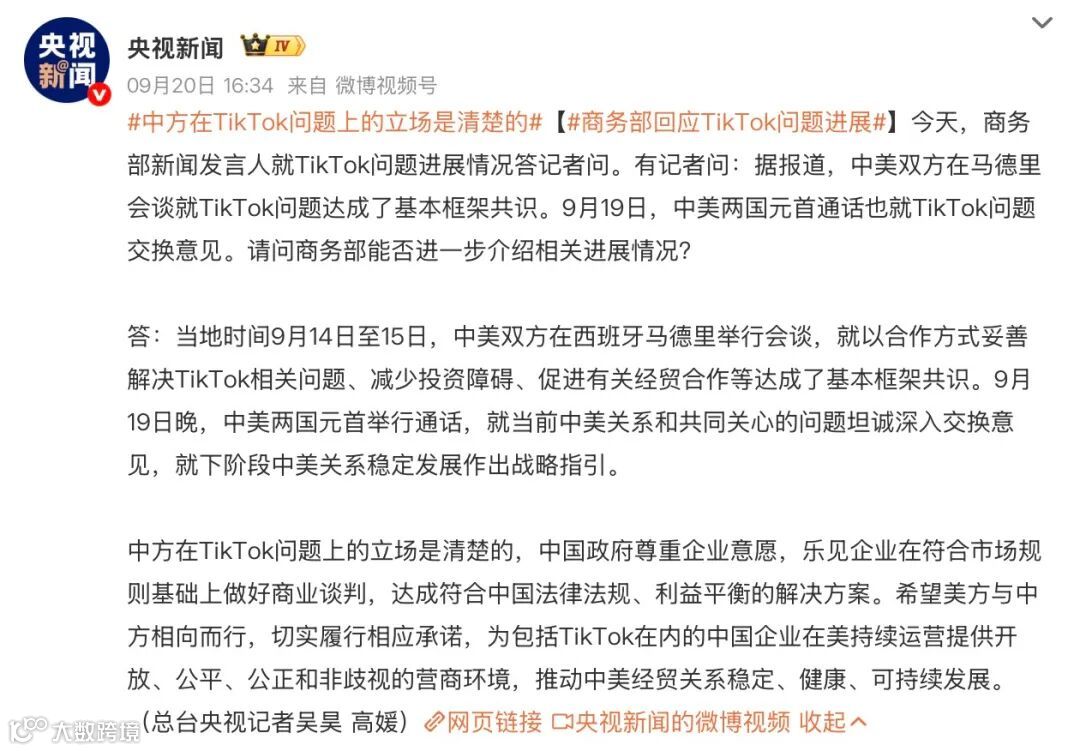9月19日,两国元首通话后表示,中方尊重企业商业意愿,支持基于市场规则的谈判;美方承诺推动磋商,妥善解决问题。