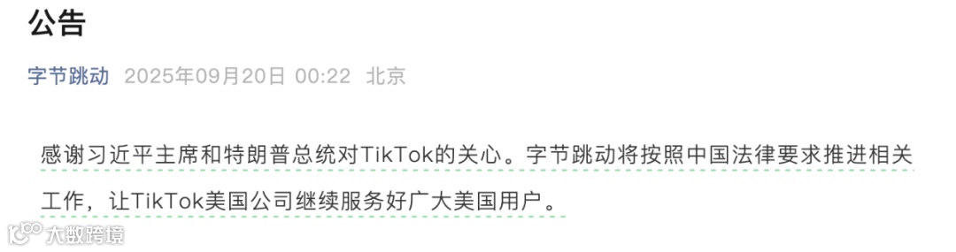 随后,字节跳动发布公告称,将依据中国法律法规推进相关工作,确保TikTok美国业务持续运营。这意味着中美高层已确认框架协议,正式转入执行阶段。