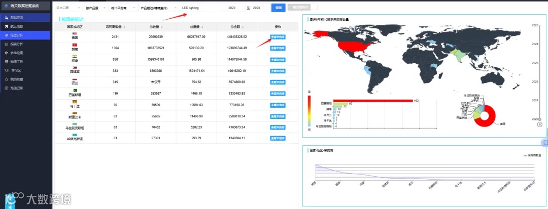 建议结合海关数据进行深度分析,通过产品关键词(如“LED lighting”)查询进口采购商信息,了解其HS编码、交易金额、数量、重量及来源国分布,辅助判断市场需求与重点开发方向。