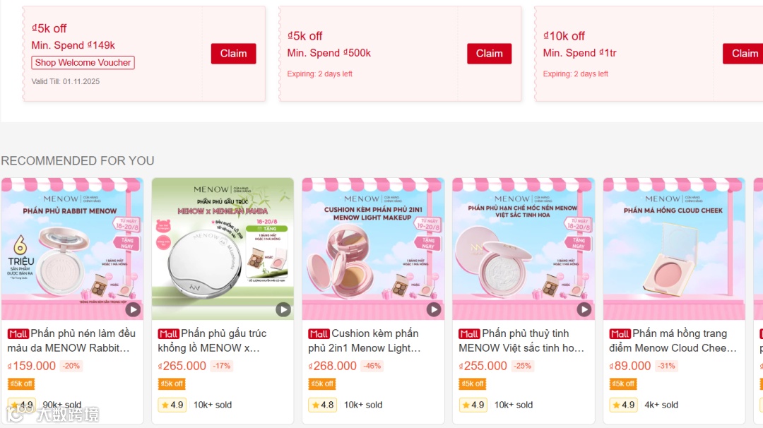 促销策略是品牌与消费者沟通、激发购买欲望的重要手段。MENOW(美诺)在东南亚市场的促销策略,除了积极利用社交媒体和KOL营销外,还通过多样化的促销活动来吸引消费者。例如,品牌会定期推出“买一送一”或“满减”等优惠活动,如购买21g粉饼赠送迷你粉饼、腮红、眉笔、眼影盘等,赠品会根据不同的季节或活动进行调整,以此刺激购买欲望并提升产品销量。这种灵活的促销方式,能够有效迎合东南亚消费者对性价比的追求。