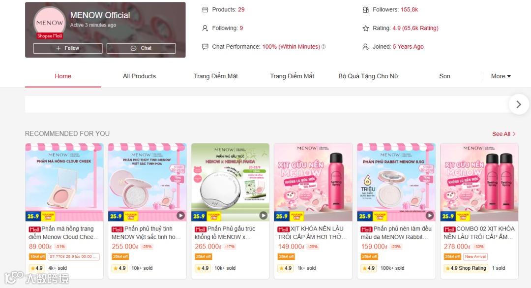 美诺的定价可以看出他们是经过深思熟虑后给出的答案,经过市场验证后,这份答卷明显有不错的成绩。其爆款产品粉饼的定价在20-70元之间,其中具体的价格又根据产品规格、促销策略而采取不同的定价,总体来说还是采取偏中低的产品定位。在电商平台如Shopee上销售产品,也为美诺提供了灵活定价的空间,可以通过促销活动、捆绑销售等方式,进一步提升产品的性价比,以适应当地消费者对价格敏感的特点。美诺作为一家以OEM起家的品牌,其在成本控制方面具有优势,这为其在海外市场提供具有竞争力的价格奠定了基础。