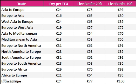 达飞轮船表示,使用欧盟每吨90欧元的碳价,并计算出干集装箱和冷藏集装箱收费:亚洲至北欧的收费将分别为每TEU 25欧元和40欧元,而欧洲至北美的收费将分别为每TEU 43欧元和65欧元。