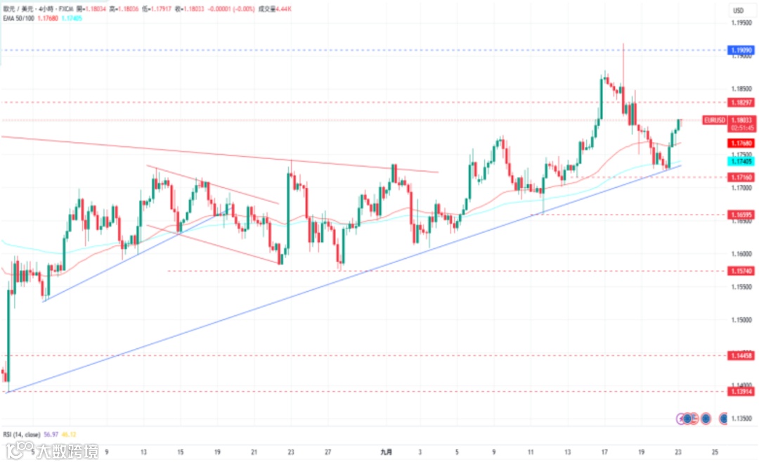 周一,欧元/美元上涨至1.18032。数据显示,欧元区9月消费者信心指数初值为-14.9,优于前值-15.5和预期-15.3。德国央行行长约内格尔表示不担忧欧元当前估值。美联储方面,部分官员对进一步降息持谨慎态度,而米兰则主张年内累计降息1.5个百分点,推动政策迅速宽松。后市关注美国PMI初值及欧元区主要国家9月PMI数据。
