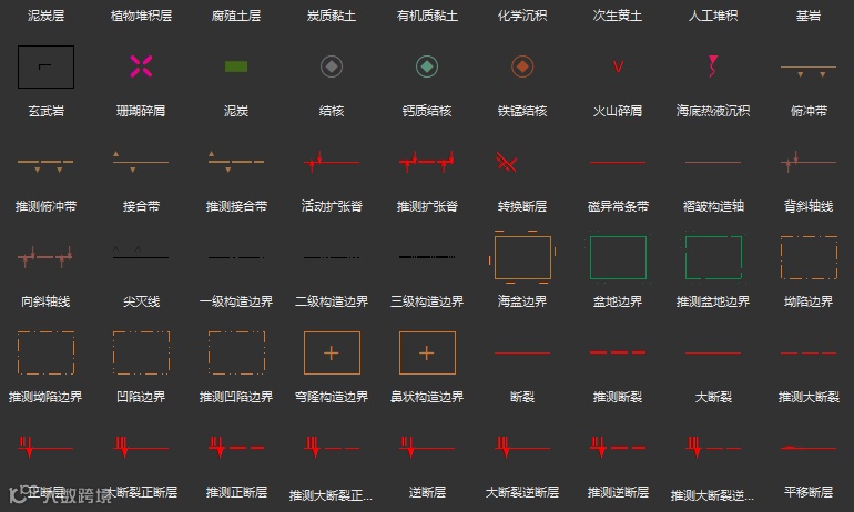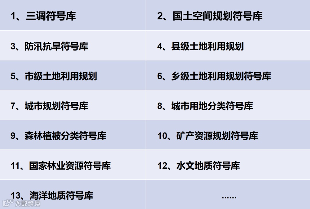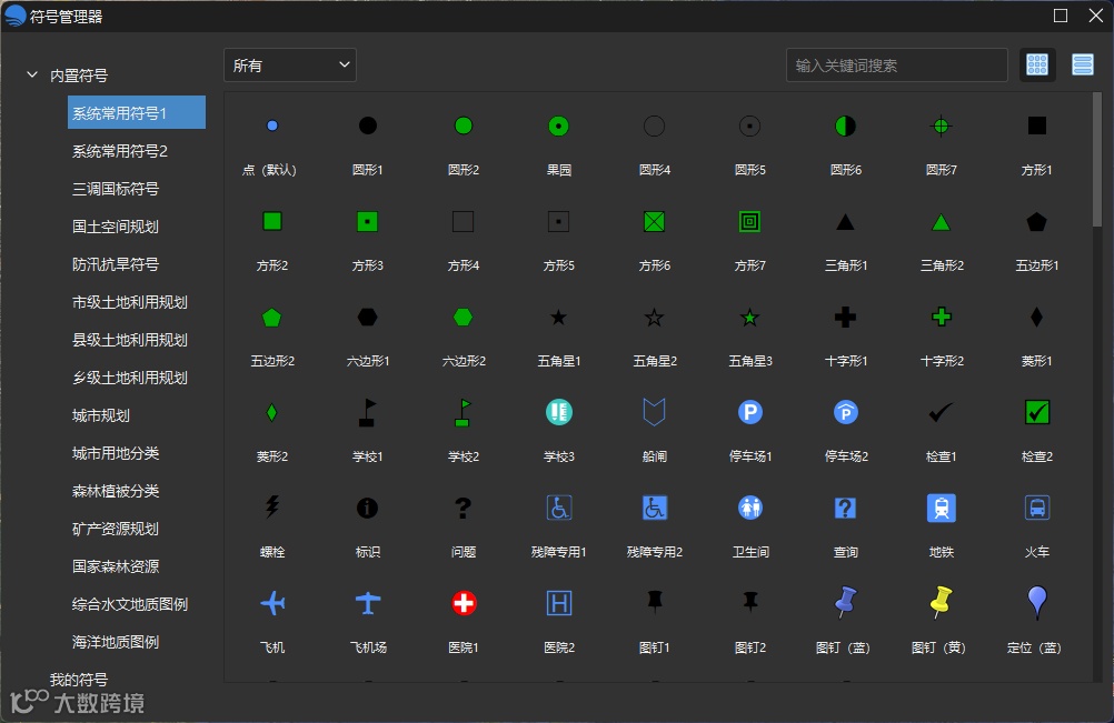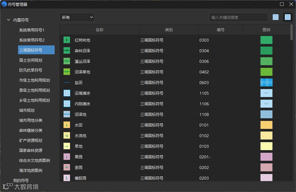 除系统默认符号外,BigemapPro内置多种专业符号库,支持以列表形式查看符号分类、编码及对应图例。