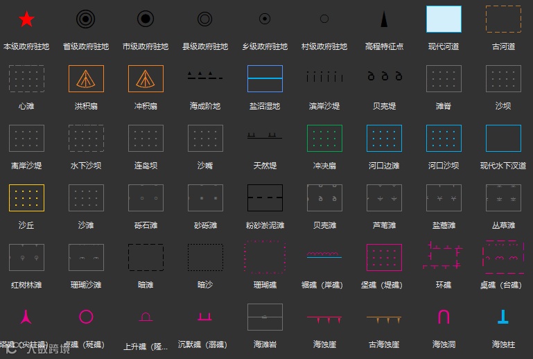 涵盖海底地形、沉积物类型等海洋地质制图所需符号。