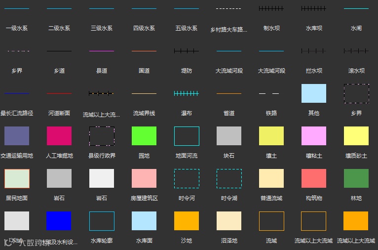 包含河道、堤坝、水闸等水利设施符号,适用于防洪排涝、水资源管理等领域。