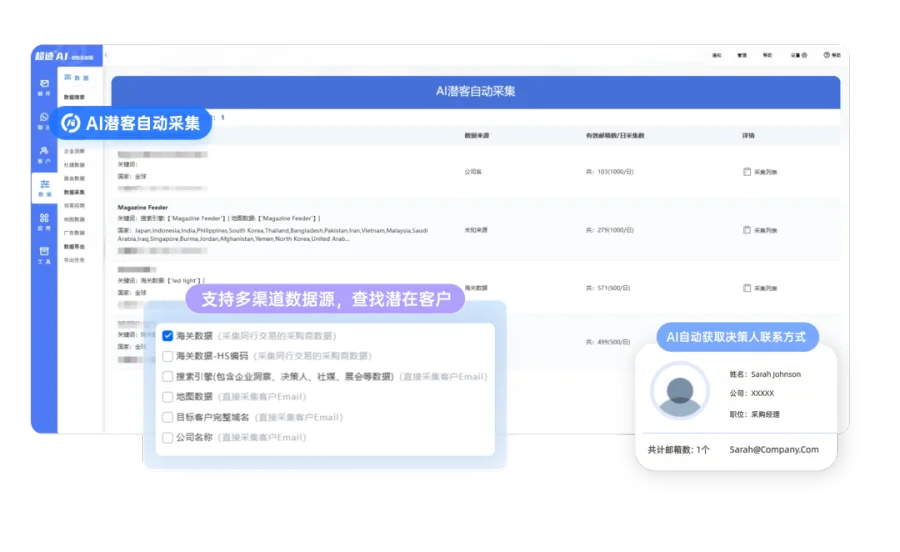 - 直达决策人:在AI搜索引擎中输入行业关键词,系统自动抓取企业官网、社媒及展会信息,输出关键联系人邮箱;