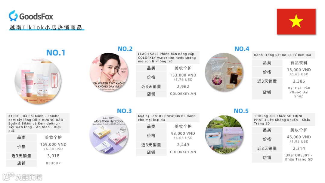 越南 TikTok 销量排行榜来看,美妆个护类产品销量增长最快。近3天销量排名前5的产品有4款属于美妆个护,分别为 BEUCUP 的脱毛霜、COLORKEY 的唇彩和面膜,以及 DKSTORE001 的防护口罩。