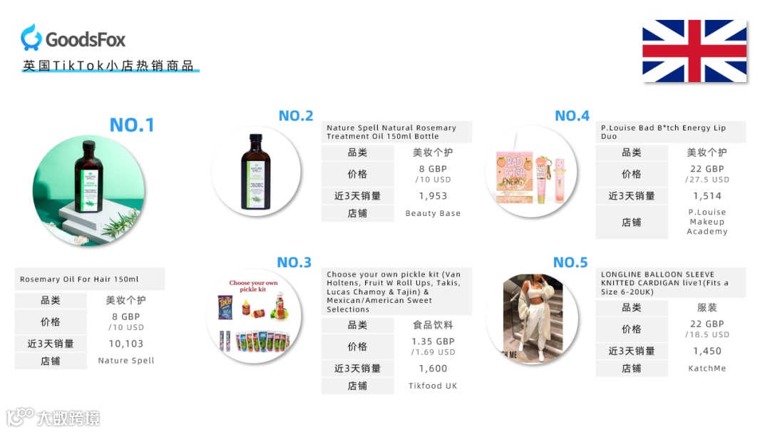 英国 TikTok 热销榜来看,近期热销产品品类有美妆个护、食品饮料和服装。其中,销量第1和销量第2的是一款迷迭香精油,该款产品近3天销量合计超过1.2万件。销量第3的是一款泡菜零食的产品。销量第4和第5的产品分别是唇膏和女装长袖针织开衫。
