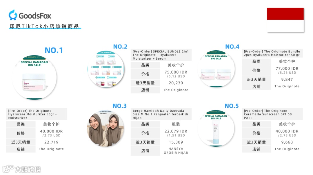 从 GoodsFox 数据来看,最近3天印尼小店中,美妆个护的类目产品销量增长快,热销产品Top10中有8款产品属于美妆个护类目。其中 The Originote 品牌旗下的4款美妆产品销量均排在前5。除此之外,销量排在第3的是一款女性穆斯林头巾,最近3天的销量为15309件。