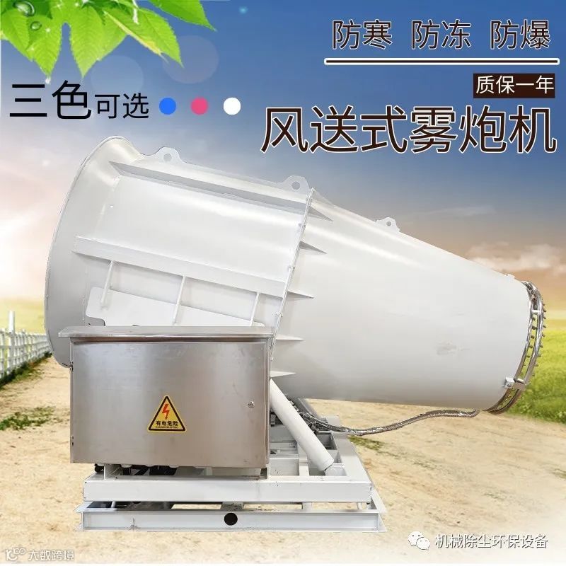 远程射雾器,又称防爆雾炮机、喷雾除尘装置、风送式喷雾机等,通过增压泵与精细喷嘴将水雾化,并借助风筒远距离输送,使微米级水雾与空气中粉尘颗粒结合沉降,实现空气净化、降尘除霾、降温保湿等功能。主要类型包括:固定式、拖挂式和车载式远程射雾器。