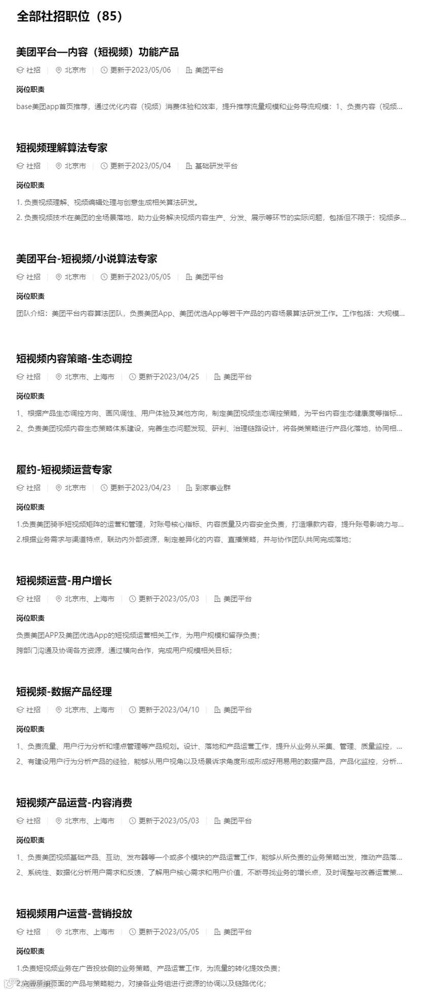 美团招聘官网上挂出了多个短视频业务相关岗位需求,包括了战略分析、后端研发、算法工程、产品运营和数据分析等不同方向,基本覆盖短视频赛道全链路。