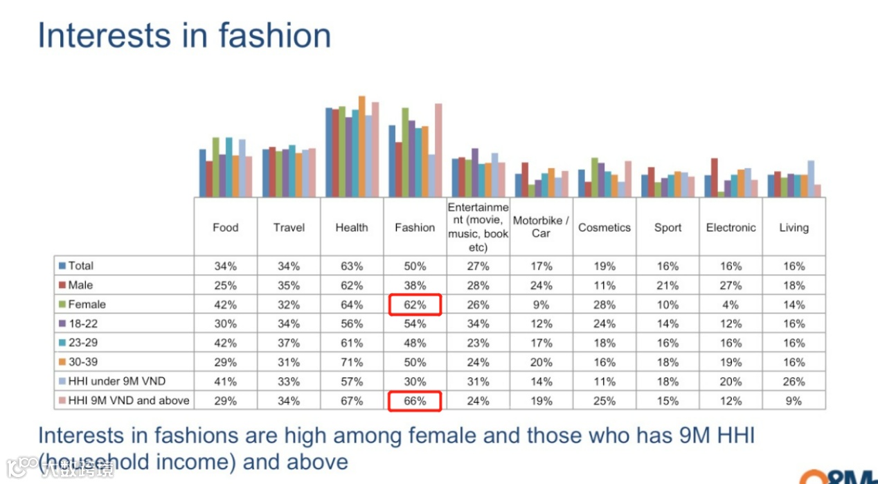在一项针对500名20-39岁越南人进行的调查中,我们发现时尚品类是越南人最感兴趣的品类之一,仅次于健康品类。并且这一数字在女性和家庭收入高于平均水平的人群中尤其高。