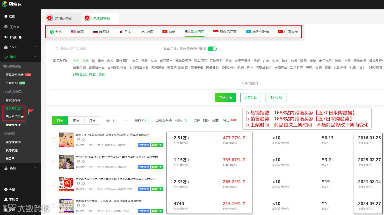 通过店雷达跨境商品榜查看近期热度趋势上涨的商品,日销售幅度飙升,说明市场热度高,需求大;能够上榜的商品,跟着卖大概率也不会出错,同时结合店雷达跨境商机榜和国家热门货盘,找到马来西亚、印尼等东南亚地区近期在1688国内供应链上游需求市场的潜在风向,店雷达打通了1688数据源优势直接可以帮助跨境卖家找到对应或类似的货源,第一时间响应市场。