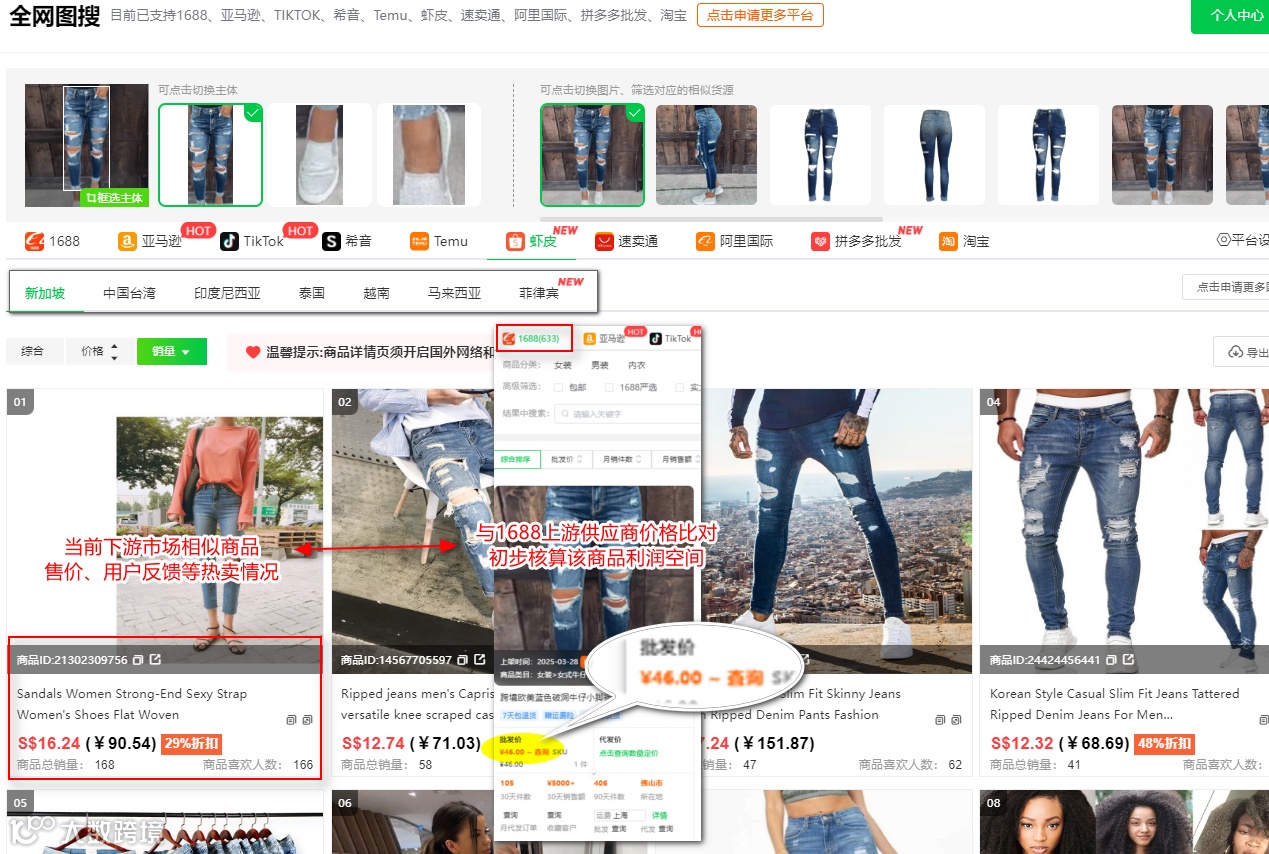 在东南亚这个对价格高度敏感的市场,性价比是利器。借由店雷达全网图搜横向对比当前主流跨境市场售卖情况,当前下游市场相似商品售价、用户反馈等热卖情况,借助国内供应链的快速反应能力,与1688上游供应商价格比对初步核算该商品利润空间,找到价格最优、质量可靠的货源。
