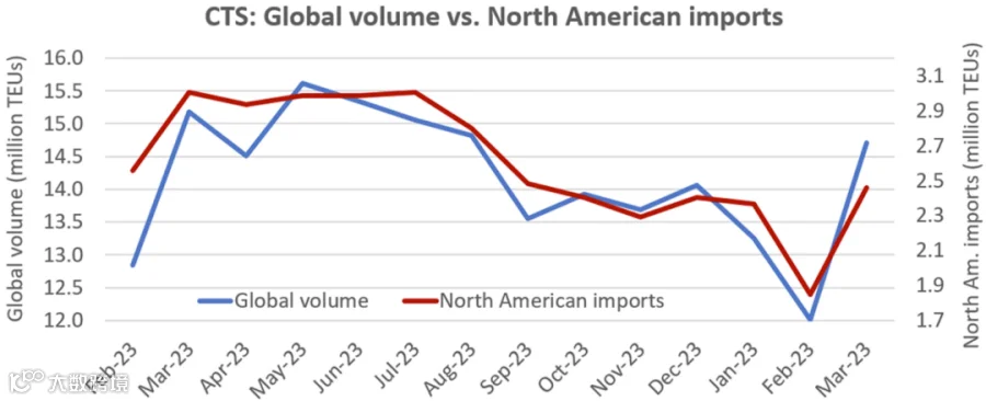 航运公司公布的全球货量数据也显示出与Descartes数据相同的上升趋势。Container Trades Statistics(CTS)公布了3月的数据,全球货量已经回升至2022年8月的水平,北美进口(包括加拿大和墨西哥)回升至同年9月的水平。