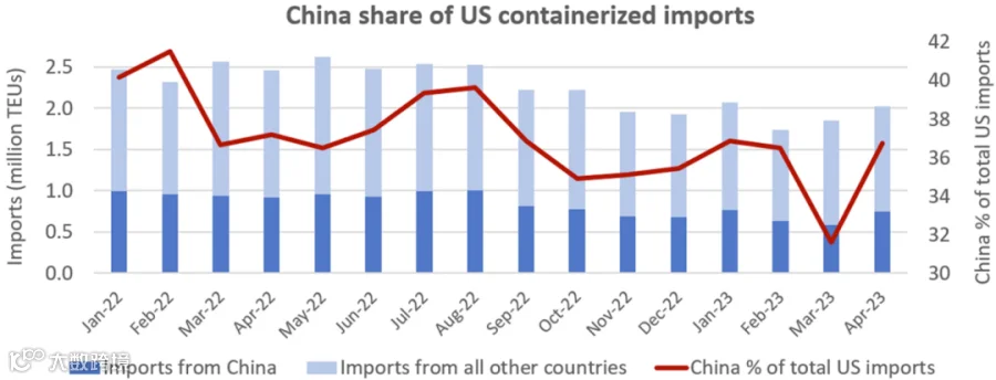 中国货物在美国进口中的份额从3月的31.6%反弹至4月的36.8%,而在2022年2月,这一份额曾高达41.5%。
