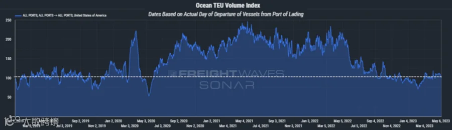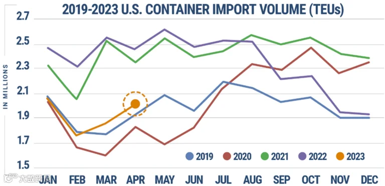 《全球港口追踪》是由美国国家零售联合会和哈克特协会发布的一份报告,涵盖了12个美国主要港口的进口流量。虽然最终数据尚未公布,但该报告预计所涵盖的港口在4月的货量将达到1732948个标准箱,比2022年4月下降23%,当时货量因疫情导致的需求激增而大幅上升;但它比3月增长了7%,比2月份增长了12%,并与2019年4月份基本持平(下降了0.7%)。
