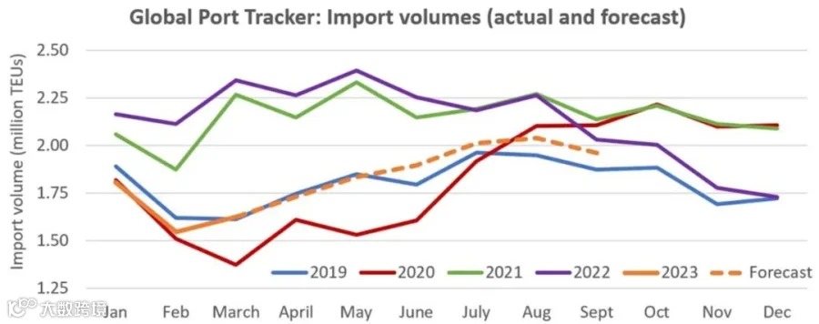 《全球港口追踪》对上半年的货量预测,从一个月前的10.8M标准箱降至10.4M标准箱,并预计上半年将出现23%的同比下降幅度,同时预测报告所涵盖的港口第三季度进口量为6M标准箱,同比下降7%。