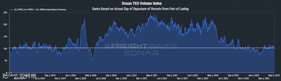 (图片来源:FreightWaves)Descartes称,4月,美国港口进口了2020197标准箱(TEU)的货物,相比一年前下降了18%,一年前美国进口商正疯狂运输货物;但与3月相比,进口量增加了9%,与疫情前的2019年4月相比,增加了5%。