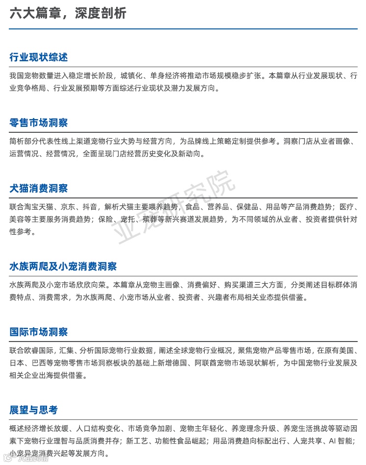 本次报告包括行业现状综述、零售市场洞察、犬猫消费洞察、水族两爬及小宠消费洞察、国际市场洞察、展望与思考六大板块。在保留往年研究维度的基础上,新增国内市场抖音渠道洞察、两爬消费洞察、企业案例分享,以及国际市场德国、阿联酋宠物零售市场内容。