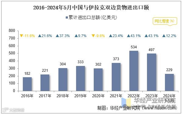 据华经产业研究院数据,2024年1至5月,中国与伊拉克双边货物进出口总额达229.17亿美元,同比增长12.2%。其中中国对伊拉克出口68.01亿美元,同比增长20.7%;自伊拉克进口161.17亿美元,同比增长8.9%。