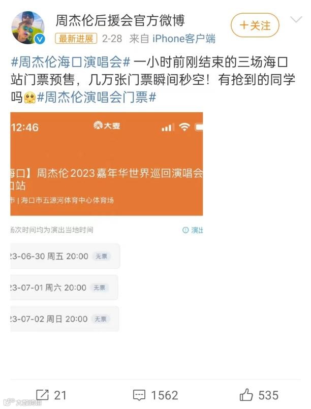 周杰伦演唱会门票秒售空。图源:微博截图