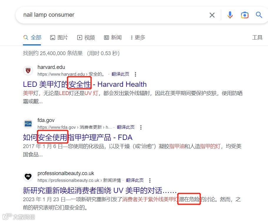 值得强调的是,美国消费者非常重视美甲灯的使用安全问题,在谷歌上搜索关键词“nail lamp consumer(美甲灯消费者)”,前排词条大多都是对于美甲灯安全问题的讨论。