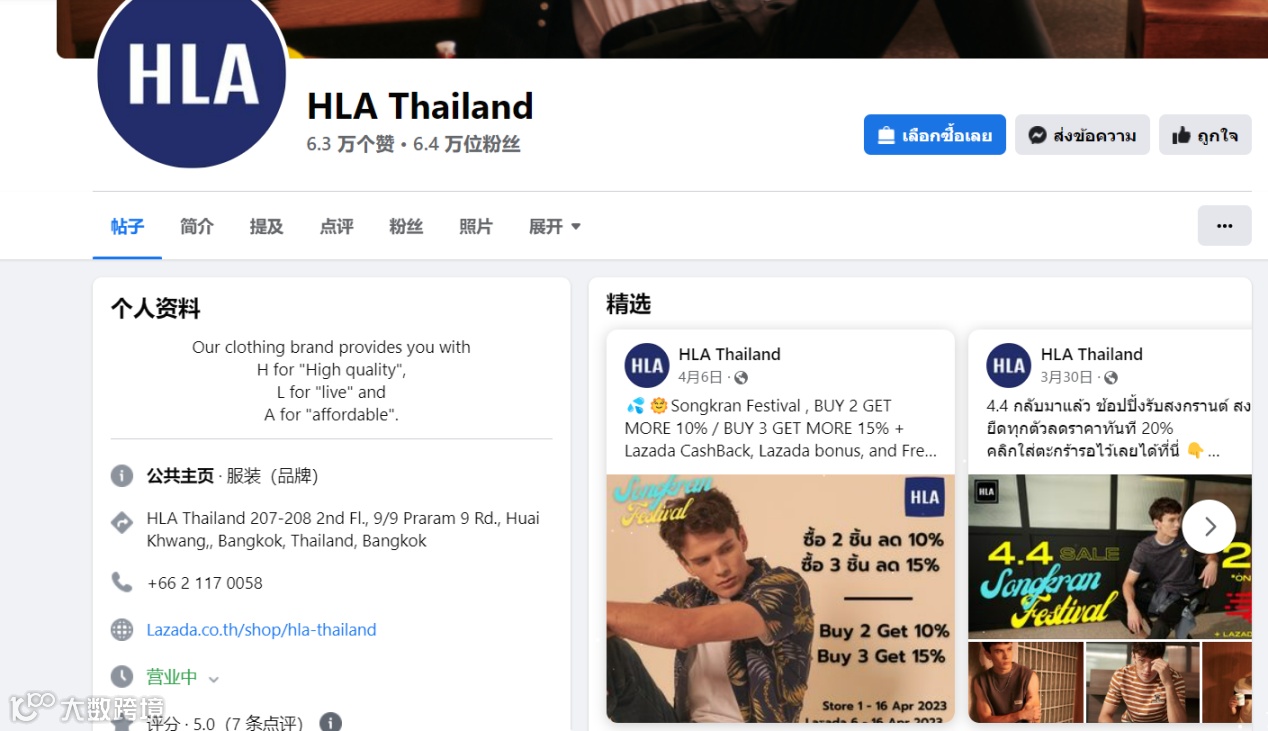 除了线下造势,海澜之家也没有忽视线上的营销,依托电商平台、社媒平台展示产品、吸引粉丝,更多依赖Facebook和Instagram进行产品发布和品牌露出,其Facebook账号HLA Thailand以发布时尚穿搭和促销活动为主,目前已经有了6.4万粉丝。