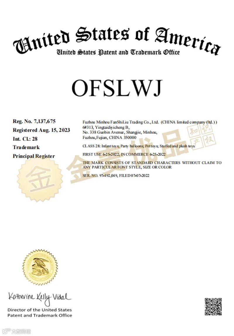 目前该案处于密封状态,但金麦优品通过排查,此次维权直指Fuzhou Minhou FanShiLiu Trading Co., Ltd. 旗下品牌OFSLWJ的商标侵权行为,覆盖多类热销产品,注册商标号为:97492049,该商标于2023年8月获批,覆盖玩具类目,未经授权使用则会面临TRO冻结、链接下架以及法律赔偿等风险。跨境卖家需立即排查,避免踩雷!
