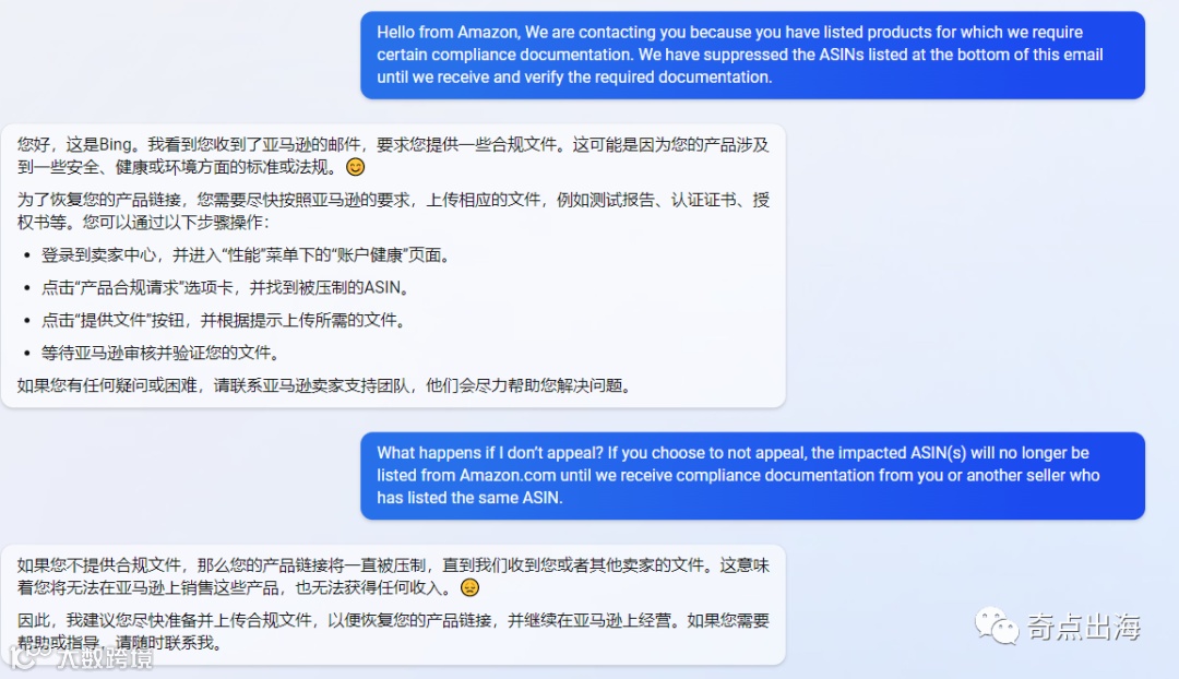 AI不仅对亚马逊申诉流程进行了详细的回复,还给出了不提供合规文件会面临的后果。