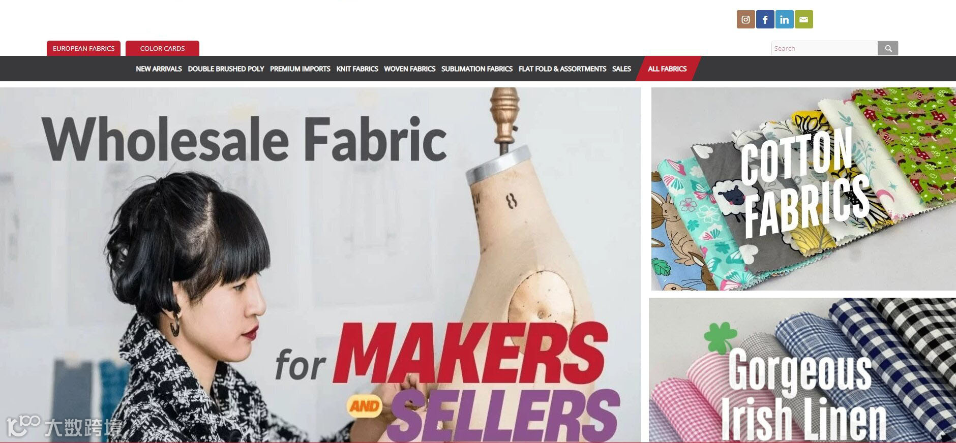 信息展示:Fabric Merchants深知“信任感”对于促成首次合作订单至关重要,为此,其在官网首页显著位置强调了“3个工作日内快速发货”的服务承诺,直接回应了客户对交付效率的关注。同时,在“关于我们”页面中,还详尽展示了企业背景:总部位于洛杉矶、深耕本地市场逾十年,拥有超过2万平方英尺的仓储与运营空间。