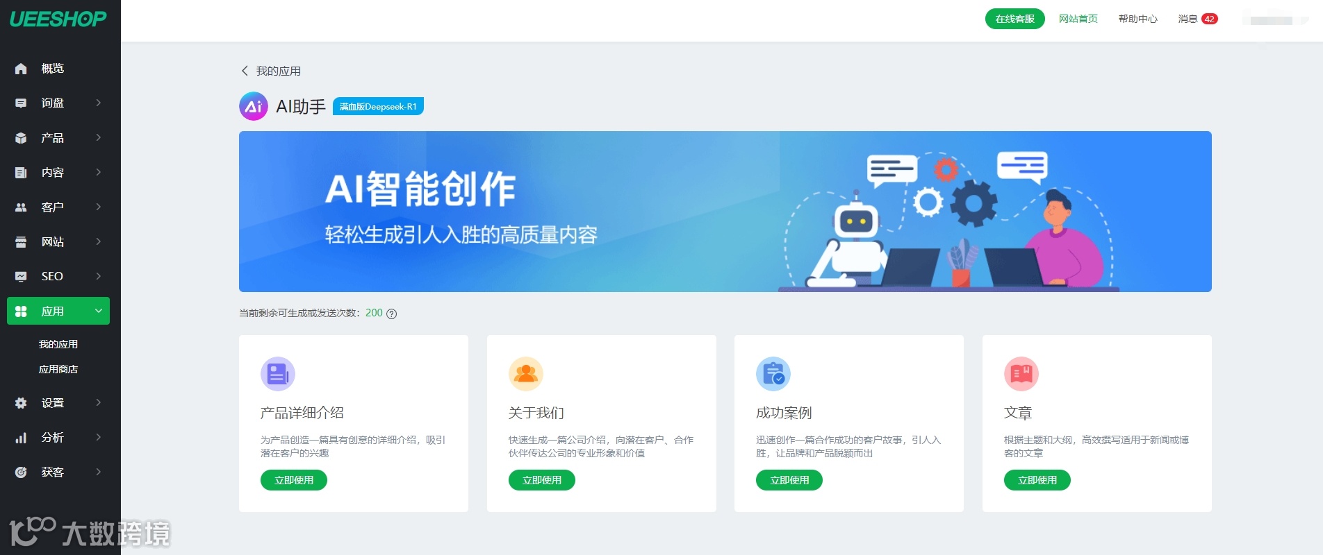 Ueeshop AI助手功能,可根据卖家输入的基础信息,快速生成高质量、吸引人眼球的产品详细介绍、关于我们、客户案例以及文章,这能够帮助卖家在提升运营效果的基础上,提高工作效率。