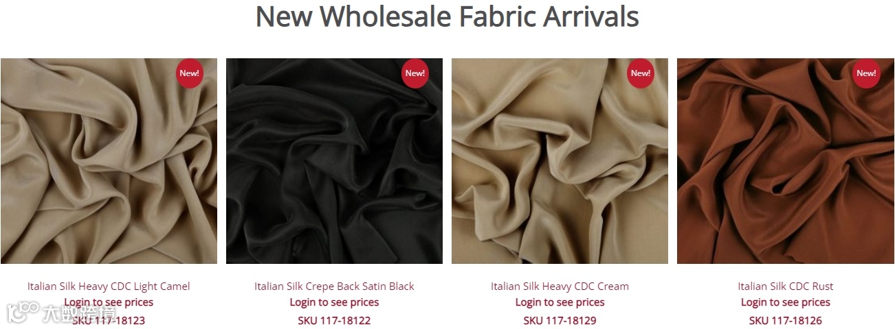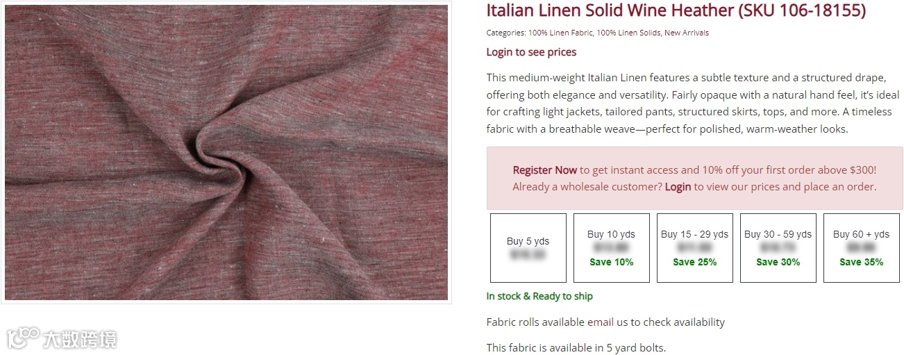Fabric Merchants清晰标注支持“5 yard起售”,并根据采购数量设置了阶梯批发折扣,既满足小型工作室、买手店、初创品牌的试样需求,也方便其在后续项目中灵活补货。这一低门槛+高度灵活度的起订策略,能够降低客户的试错成本和心理负担,为后续的复购与信任积累打下基础。