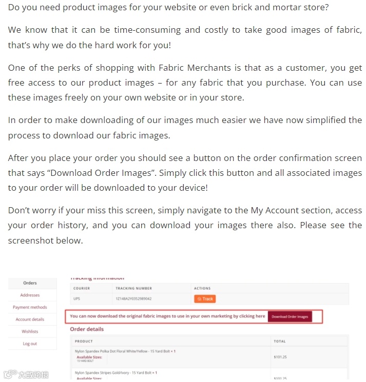 Fabric Merchants提供下单后的一键式图片打包下载服务,涵盖所购产品的高清图、纹理细节图、多角度展示图等素材。这不仅能够帮助客户节省拍摄与设计成本,还能显著压缩“从采购到上架”的时间周期,实现下单即上架、上线即售卖的敏捷运营目标,所以其是能够有效促进询盘转化的。