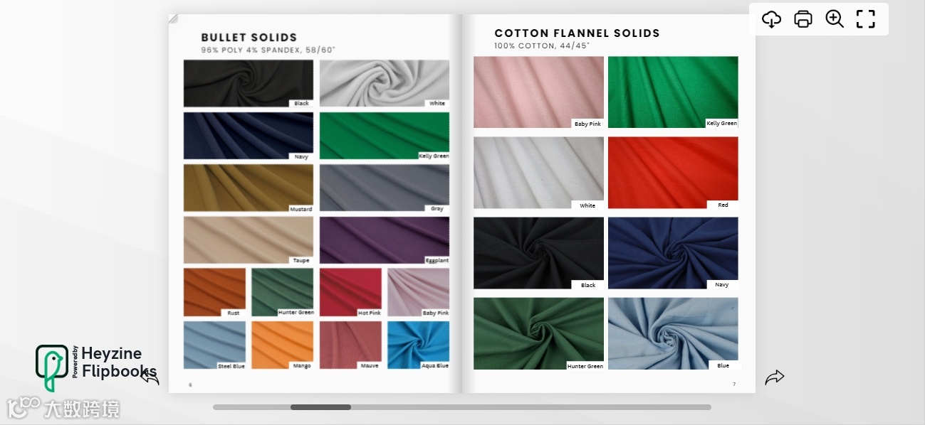 针对这一痛点,Fabric Merchants为重点产品提供可下载打印的电子色卡资料,包括标准配色名称、RGB对照、材质注释等视觉辅助信息,方便客户提前确认面料风格、颜色适配与搭配方式。这能在无法获取实体样布的场景中,大幅提升判断效率降低误判成本,是许多高频采购型客户反复使用的重要工具。