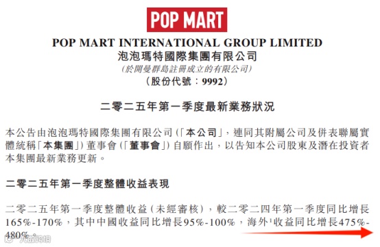 再看今年第一季度,泡泡玛特营收与去年Q1相比增长了165%-170%,而海外的营收同比竟暴增了475%-480%,美国市场增速最快,同比增长达到895%-900%。