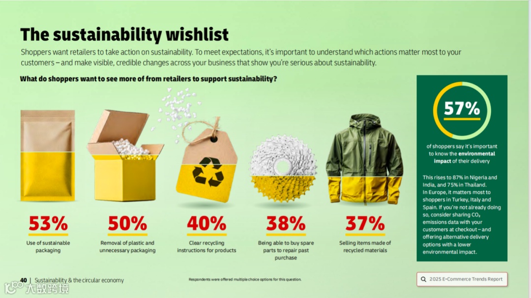 可持续发展已由品牌加分项转为基本需求。全球72%消费者在网购时关注可持续性,其中三分之一曾因此放弃订单,Z世代该比例高达近50%。