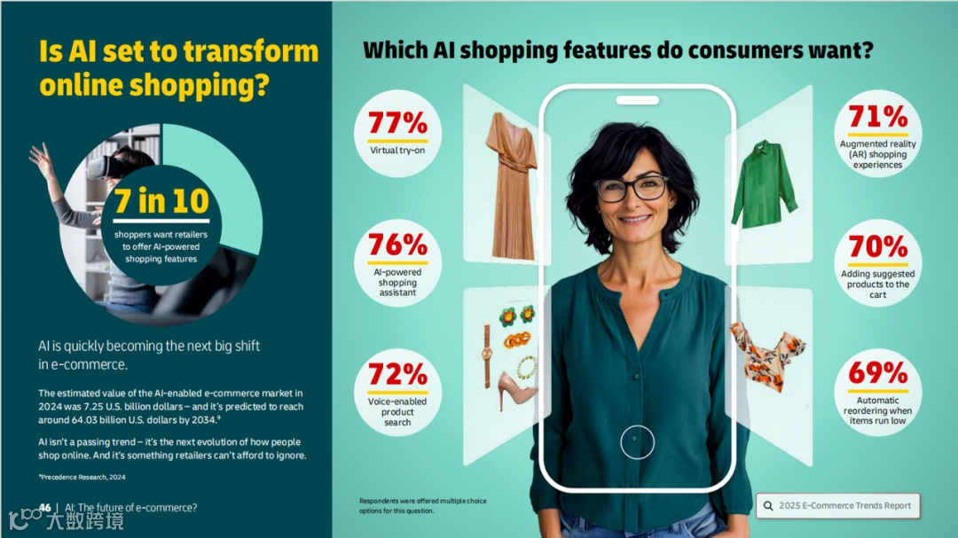 生成式AI正推动新一轮消费变革。DHL报告显示,70%全球购物者希望零售商提供AI购物功能,虚拟试穿、AI导购和语音搜索成为最受欢迎的应用。目前已有37%消费者通过语音指令购物,社交商务用户中该比例接近一半。随着数字体验要求提升,融合实用性与趣味性的智能化购物路径正成为刚需。