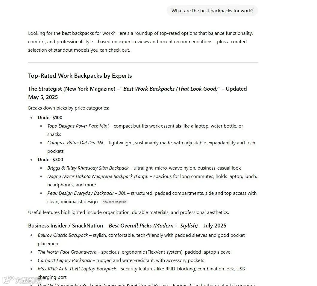 当被问及最适合工作的背包时,Perplexity 的结果。