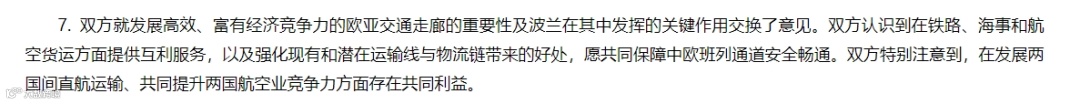 “双方就发展高效、富有经济竞争力的欧亚交通走廊的重要性及波兰在其中发挥的关键作用交换了意见。双方认识到在铁路、海事和航空货运方面提供互利服务,以及强化现有和潜在运输线与物流链带来的好处,愿共同保障中欧班列通道安全畅通。双方特别注意到,在发展两国间直航运输、共同提升两国航空业竞争力方面存在共同利益。”