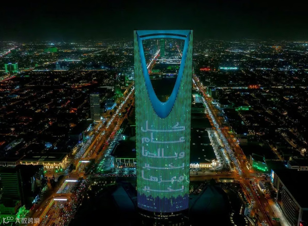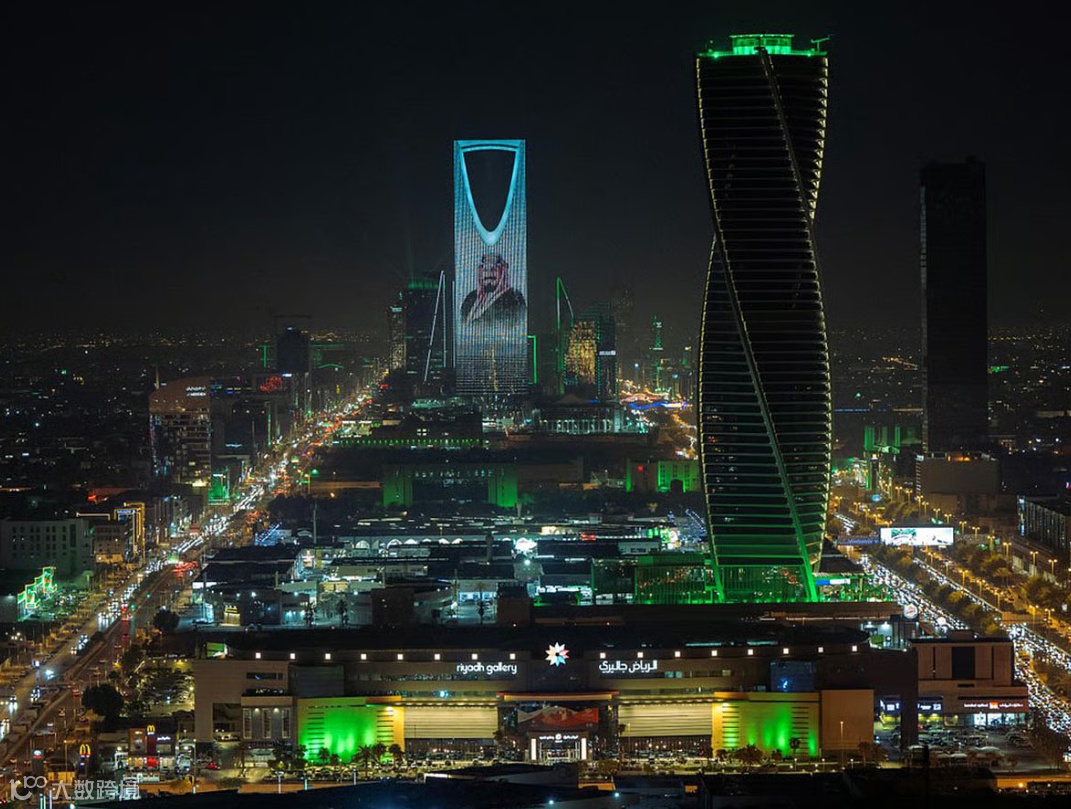 沙特阿拉伯迎来第95周年国庆,全国举行盛大庆祝活动,利雅得的城市天际线被象征国旗的绿白两色灯光点亮,彰显国家自豪与团结。