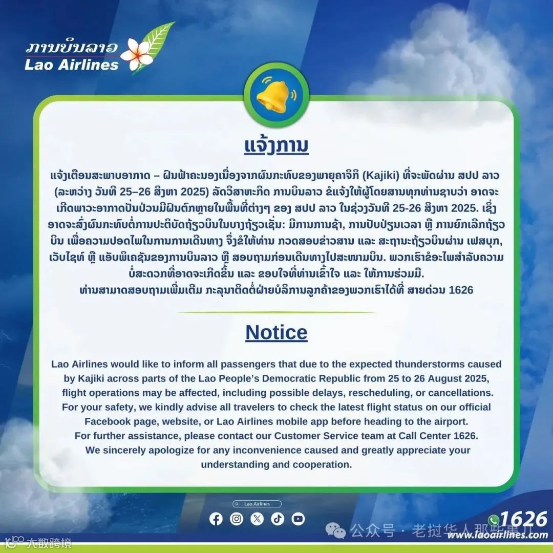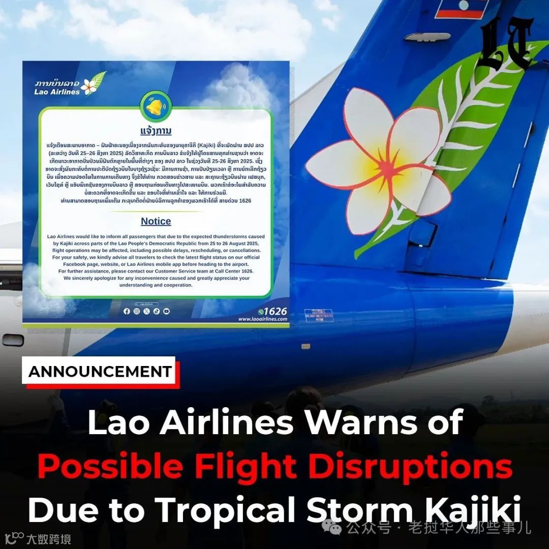 老挝航空提醒,受热带低压带来的不稳定天气影响,部分航班可能出现延误、调整或取消。建议旅客密切关注航班动态,留意航空公司发布的更新通知。