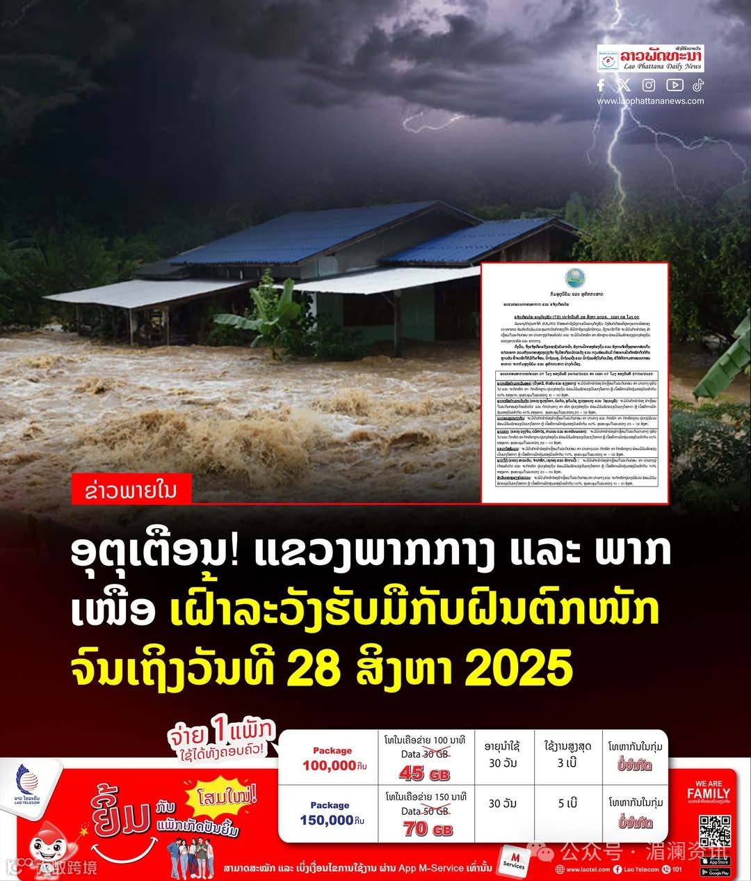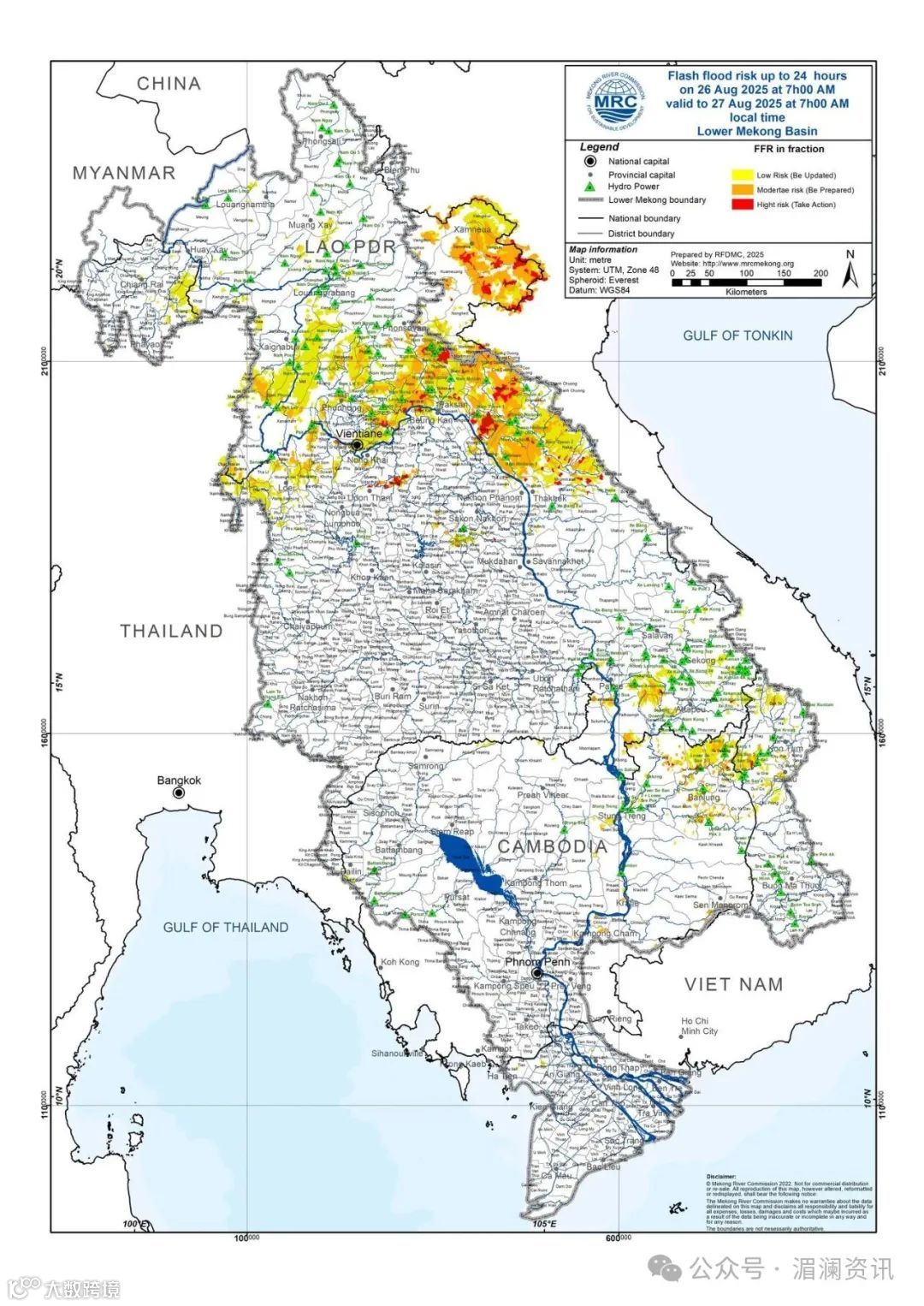 2025年8月26日,湄公河委员会发布未来24小时降雨量与洪水灾害预警。受热带风暴“卡吉基”减弱后的热带低压影响,老挝中部及北部多个省份出现强降雨,波里坎赛、甘蒙、赛宋本和川圹四省为洪灾高风险区域。