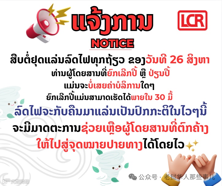 受“卡吉基”持续影响,老中铁路有限公司决定于2025年8月26日全线暂停旅客列车运行,以确保旅客安全。目前老挝北部及中部仍存在较大自然灾害风险,不具备列车开行条件。