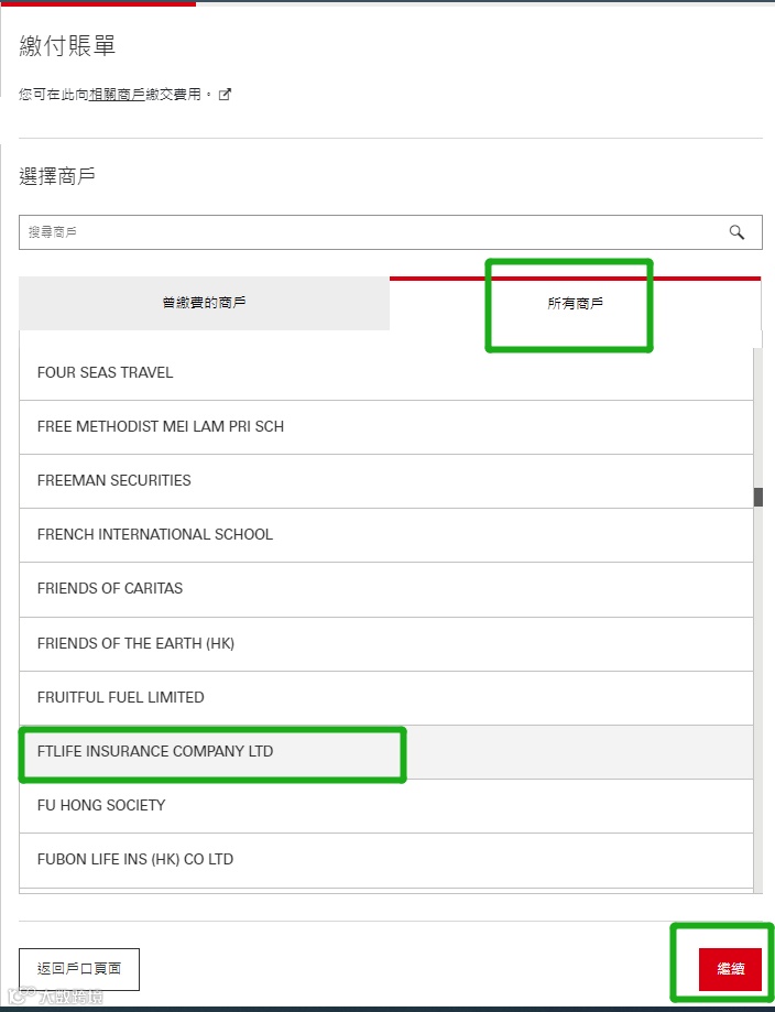 - 登录网银 → 选择「缴付账单」→ 点击「选择商户」→ 搜索保司名称