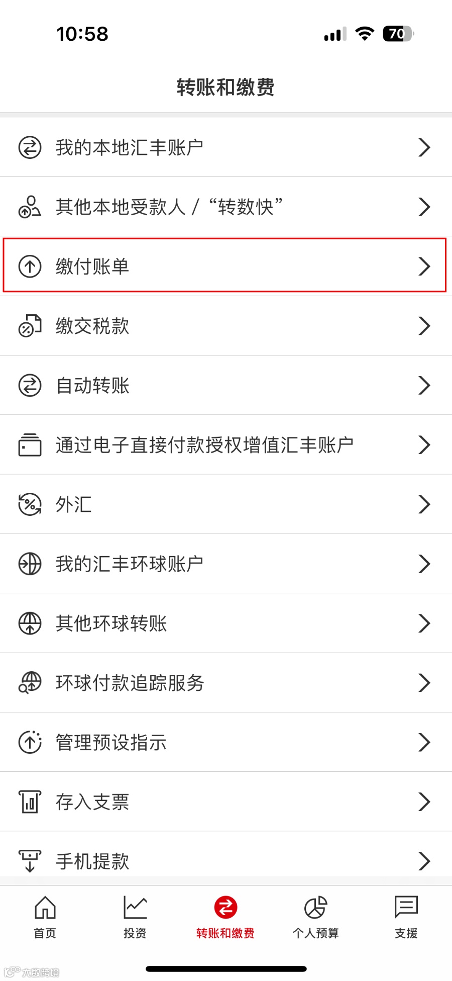 - 打开APP,进入「转账和缴费」→「缴付账单」